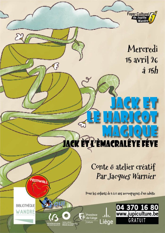 Qui ne connaît pas le célèbre conte populaire de Jack èt l’èmacralêye féve · Jack et le haricot magique? Jacques Warnier du Criwé, une référence en littérature wallonne, revient nous raconter sa version revisitée ! Cette lecture vous est proposée en partenariat avec la Bibliothèque de Wandre, et elle est destinée aux enfants, accompagnés de leur adulte préféré.